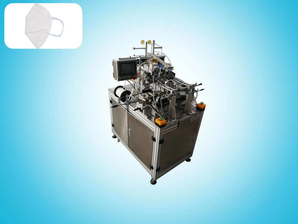 本機臺是將松緊帶以超聲波溶合于口罩本體兩側,進而完成耳帶式口罩成品的自動化機臺;只需一個操作員將口罩本體(片體)一片一片放入送帶治具上,機械后續動作至成品完全皆由機臺自動操作完成。